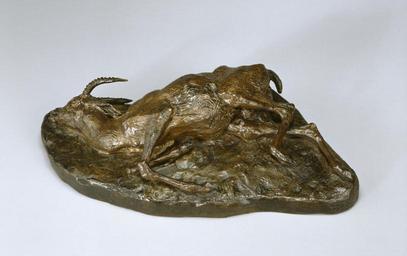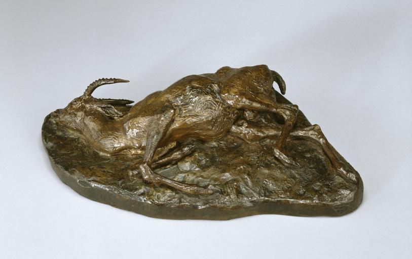 Keywords: Honoré Gonon - Dead Gazelle - Walters 2796 - Profile.jpg Walters Art Museum artwork Creator Honoré Gonon Founder <br/> The African gazelle lies on the ground its legs awkwardly splayed and its neck extended at an unnatural angle The artist has conveyed the appearance of death with remarkable realism A plaster model of this sculpture was exhibited at the Paris Salon of 1833 The following year Barye cast this unique bronze version which was the first of Barye's bronzes acquired by the duke of Orléans modeled 1832; cast as unique piece 1833-1834 bronze with dark brown patina over metallic flake layer cm 7 6 30 2 19 1 accession number 27 96 19596 Duke of Orleans Paris J Montaignac Paris Henry Walters Baltimore March 31 1902 by purchase George A Lucas as agent Walters Art Museum Henry Walters Acquired by Henry Walters 1902 Signature Cast through from model BARYE 1832; Transcription Inscribed on base FONDU PAR HONORE GONON ET SES DEUX FILS; Translation Founded by Honore Gonon and his two sons; Mark Cold struck along base FPO 141 and FPO double struck FPO representing a monogram of Ferdinand-Philippe duc d'Orléans Untamed The Art of Antoine-Louis Barye The Walters Art Museum Baltimore; Philbrook Museum of Art Tulsa; The Henry Morrison Flagler Museum Palm Beach 2007-2008 place of origin Paris France Walters Art Museum license Sculptures by Antoine-Louis Barye Jean-Honoré Gonon Media contributed by the Walters Art Museum needs category review Sculptures in the Walters Art Museum Media contributed by the Walters Art Museum needs artist review |