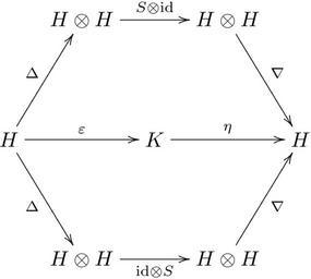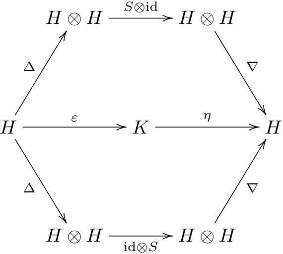 Keywords: Hopf algebra.svg en A commutative hexagon expressing all the axioms of a Hopf algebra own Ryan Reich 2009-04-29 File HopfAlgebra png Source code <pre> \documentclass article \usepackage amsmath amssymb nopageno \usepackageall xy \DeclareMathOperator \id id \begin document \begin equation \xymatrix C-1 5em R+2em H \otimes H \arrr S \otimes \id H \otimes H \ardr \nabla \\ H \arur \Delta \ardr_ \Delta \arrr \varepsilon K \arrr \eta H \\ H \otimes H \arrr_ \id \otimes S H \otimes H \arur_ \nabla \end equation \end document </pre> Commutative diagrams Images with LaTeX source code |