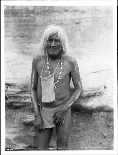 Keywords: Hopi Priest with bag of sacred meal for the Flute Dance Ceremony at the pueblo of Walpi, Arizona, ca.1898 (CHS-4644).jpg en <br> Hopi Priest with bag of sacred meal for the Flute Dance Ceremony at the pueblo of Walpi Arizona ca 1898 Photograph of a Hopi Priest with bag of sacred meal slung from his neck for the Flute Dance Ceremony at the pueblo of Walpi Arizona ca 1898 He wears only a loin cloth and a silver necklace His arms are decorated in white paint or dried mud He has straight white hair hanging to his shoulders A rocky wall is behind him Call number CHS-4644 Legacy record ID chs-m16969; USC-1-1-1-13885 Photographer James George Wharton Filename CHS-4644 Coverage date circa 1898 Part of collection California Historical Society Collection 1860-1960 Type images Geographic subject city or populated place Walpi Repository name USC Libraries Special Collections Accession number 4644 Microfiche number 1-162- Archival file chs_Volume97/CHS-4644 tiff Part of subcollection Title Insurance and Trust and C C Pierce Photography Collection 1860-1960 Repository address Doheny Memorial Library Los Angeles CA 90089-0189 Geographic subject country USA Format aacr2 3 photographs glass photonegative photoprints b w ; 22 x 17 cm 26 x 21 cm Rights Digitally reproduced by the USC Digital Library; From the California Historical Society Collection at the University of Southern California Subject adlf religious facilities Project USC Repository email specol usc edu Identifying number unidentified no James-305 Contributing entity California Historical Society Date created circa 1898 Publisher of the digital version University of Southern California Libraries Format aat photographic prints; photographs Geographic subject state Arizona Subject file heading Indians -- Hopi -- Flute Dance Geographic coordinates -110 397217 35 832218 Format glass plate negatives Access conditions Send requests to address or e-mail given Phone 213 821-2366; fax 213 740-2343 Geographic subject county Navajo Subject lcsh Indians of North America; Hopi Indians; Dance; Rites and ceremonies Subject Hopi Indians; Hopi Flute Ceremony circa 1898 date created George Wharton James 1858 1923 http //digitallibrary usc edu/cdm/ref/collection/p15799coll65/id/16888 PD-old-70-1923 Images from USC Digital Library uploaded by Fæ Photographs by George Wharton James California Historical Society Collection 1860-1960 Glass plate negatives Hopi men |