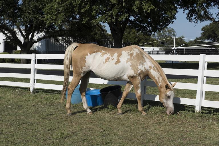 Keywords: horse corral fence ranch animal livestock outdoors pen grazing food water spotted
