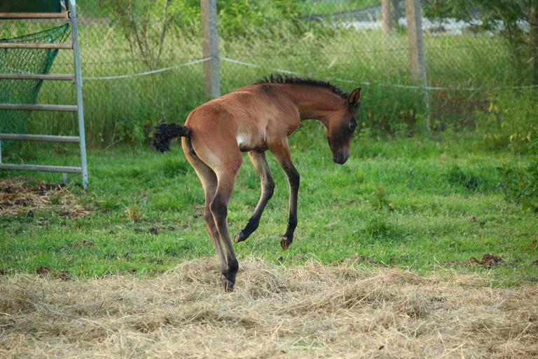 Keywords: horse foal suckling brown mold thoroughbred arabian high spirits buck jump pasture meadow