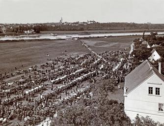 | Keywords: Horse market in Lorenzkirch.jpg  Ausschnitt aus dem Pferdemarkt in Lorenzkirch Gemeinde Zeithain Sachsen Deutschland Blick vom Kirchturm in Lorenzkirch zum Pferdemarkt einem Teil des Viehmarktes zur Elbe und zur Stadt Strehla Der Viehmarkt von Lorenzkirch bestand von 1690 bis 1992 er war Teil des Laurentiusmarktes Im Jahr 1859 auf dem Höhepunkt des Laurentiusmarktes standen hier 2900 Pferde zum Verkauf Vom 13 Jahrhundert bis zur Reformation blieb die Laurentiuskirche von Lorenzkirch eine Wallfahrtskirche und der Laurentiusmarkt wurde anfangs jeweils am 10 August dem Laurentiustag genannten Sterbetag des Laurentius von Rom abgehalten Der auf der Talsanddüne entstandene Ort Lorenzkirch hatte ab 1791 als Marktflecken mit seinen 1834 neu bestätigten Marktrechten eine große wirtschaftliche Bedeutung wegen des Lorenzmarktes der Pferdezüchter Viehzüchter Händler und Handwerker aus weitem Umkreis anzog In der Gegenwart wird der Lorenzmarkt als mehrtägiges Volksfest mit einem eintägigen Verkaufsmarkt begangen Pohled na část koňského trhu v saském Lozenkirchu z konce 19 století V pozadí řeka Labe a město Strehla Fotografie byla pořízena z kostelní věže v Lozenkirchu A part of the horse market in Lorenzkirch Zeithain Saxony Germany View from the church steeple in Lorenzkirch to the horse market to the river Elbe and to the town Strehla Vue partielle du marché aux chevaux de Lorenzkirch sur la commune de Zeithain en Saxe Allemagne Photo prise depuis le clocher de l'église de Lorenzkirch to the horse market Derrière le marché l'Elbe et la ville de Strehla sont visibles Scan of the photography with Epson perfection 4490 Photo Retouched image perspective adjusted and restoration of the image with Adobe Photoshop CS3 by Michael Gäbler 1891 1903 Author The File Horse market in Lorenzkirch Scan of the photography jpg is a scan of the photography without any restoration of the image Assessments c 2009 1 picture of the day 2010 08 15 51 21 17 46 N 13 14 33 16 E zoom 18_region DE PD-old-70-1923 Lorenzmarkt in Lorenzkirch History of Lorenzkirch Views of Strehla Elbe in Strehla Black and white photographs Horse markets in Germany Featured pictures of Saxony Horses of Landkreis Meißen |