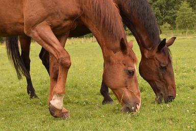 Keywords: horses stallions brown graze pasture meadow together friends
