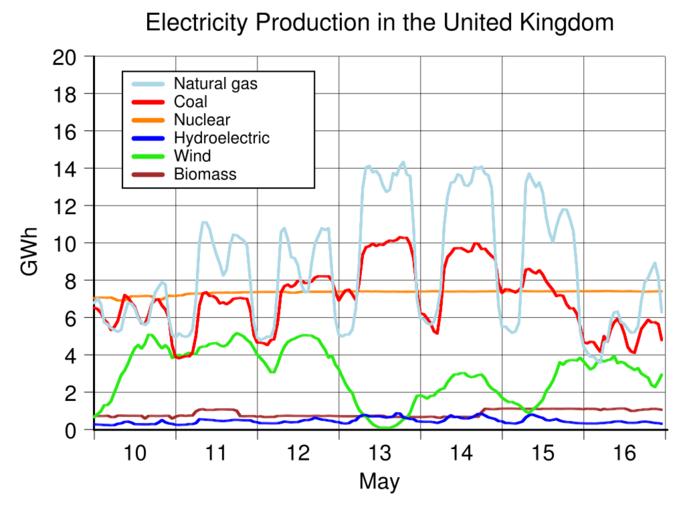 | Keywords: Hourly electricity generation in the UK May 10-16 2015.svg translate yes en Hourly electricity generation in the United Kingdom from May 10-16 2015 A year later generation from coal dropped to zero Data from http //www ref org uk/fuel/index php valdate 2015-05-10 REF 2016-05-16 own Delphi234 other versions Generated with Wikimedia SVG Chart SVG Chart/box cc-zero Electricity production trends Electricity in the United Kingdom May 2015 in the United Kingdom | ||||