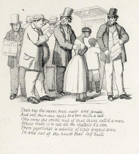 | Keywords: House That Jeff Built p7.jpg en Panel from 1863 cartoon The House That Jeff Built satirizing Jefferson Davis and the slave trade Panel 7 showing slave merchants around a young woman slave; a child slave is in the background Text These buy the slaves both male and female and sell their own souls to a boss with a tail who owns the small soul of that thing call ™d a man whose trade is to sell all the chattels he can from yearlings to adults of life ™s longest span in and out of the house that Jeff built The boss with a tail refers to the Devil 1863-07 The House That Jeff Built 1863 cartoon David Claypoole Johnston other versions PD-old-70-1923 Fashion in 1863 The House That Jeff Built Slave trade in the United States |