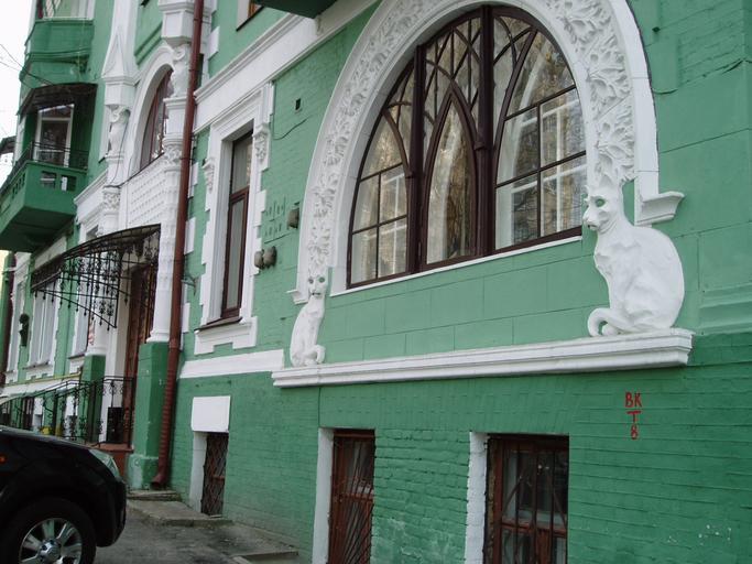 Keywords: House with cats Kyiv 03.jpg en An arched window at the ground floor of the House with Cats in Kyiv guarded by two cats respectively А очне вікно на пе шому пове сі Будинку з котами у Києві що охо оняється двома котами 80-391-0253 Own Martofliak 2009-04-05 own work Arch windows Semi-circular arches House with Cats Art Nouveau architecture in Ukraine