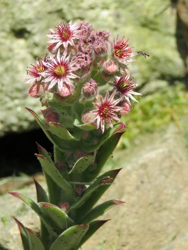 Keywords: houseleek blossom bloom sempervivum thick sheet greenhouse stone crop solitary bee