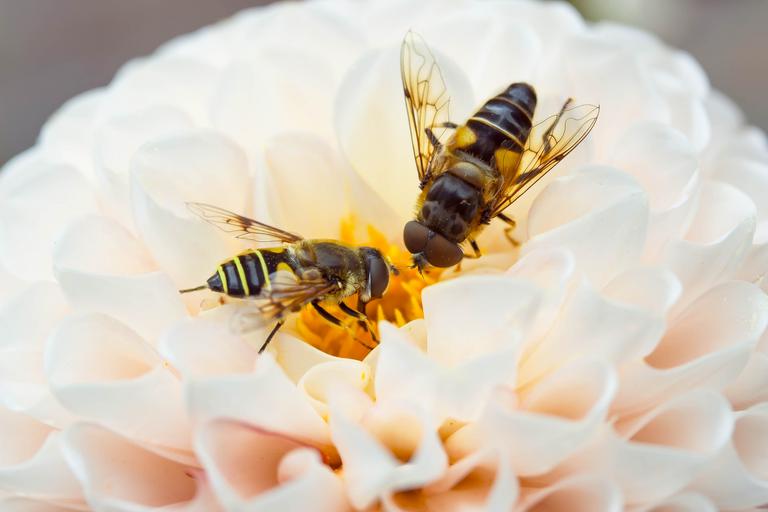 Keywords: hover fly insect animal fly mist bee nectar search collect nectar blossom bloom white dahlia dahlia nature