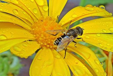 Keywords: hoverfly dung fly insect blossom bloom marigold calendula drop of water wet raindrop drink thirst nature