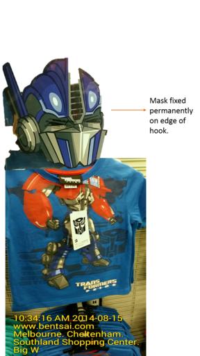 The mask in the plastic packaging that is attached to the shirt/hanger via a plastic cable is to be re-positioned to the back of the shirt. This allow customers to take the clothing on the hanger off the hook at the back of the permanently fixed mask without the other masks obstructing the cartoon image.