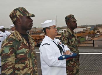 Keywords: HSV Swift attends APS Graduation in Port Gentil 110704-N-XK513-010.jpg en Petty Officer 1st Class Marc Vue logistics specialist prepares to raise the colors aboard the High Speed Vessel Swift HSV 2 during a special Fourth of July colors ceremony involving two sailors with the Marine Nationale of Gabon Swift is currently participating Africa Partnership Station 2011 Africa Partnership Station is an international security cooperation initiative facilitated by Commander U S Naval Forces Europe-Africa aimed at strengthening global maritime partnerships through training and collaborative activities in order to improve maritime safety and security in Africa Photo by Petty Officer 3rd Class Ian Carver 2011-07-04 Ian Carver https //www dvidshub net/image/424511 110704-N-XK513-010 2011-07-07 02 39 PORT GENTIL GA PD-USGov-Military-Navy HSV-2 Swift ship 2003 Africa Partnership Station 2011 Images from DoD uploaded by Fæ |
