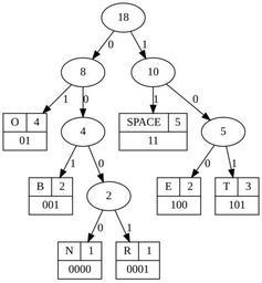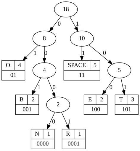 Keywords: Huffman (To be or not to be).svg en Huffman tree based on the phrase To be or not to be de Huffmanbaum basierend auf der Phrase To be or not to be huffman ooz ie/tree dot text TO BE OR NOT TO BE huffman ooz ie 2013-05-19 <gallery>File Tobeornot png Old png version</gallery> Created with Graphviz Graphviz source <source lang dot > / Huffman Tree DOT graph DOT Reference http //www graphviz org/doc/info/lang html http //en wikipedia org/wiki/DOT_language Timestamp 1368947341 Phrase 'TO BE OR NOT TO BE' Generated on http //huffman ooz ie/ / digraph G edge label 0; graph ranksep 0; N shape record label 1 0000 ; R shape record label R 1 0001 ; B shape record label B 2 001 ; O shape record label O 4 01 ; E shape record label E 2 100 ; T shape record label T 3 101 ; SPACE shape record label SPACE 5 11 ; 18 -> 8 -> 4 -> 2 -> N; 10 -> 5 -> E;2 -> R label 1; 4 -> B label 1; 8 -> O label 1; 5 -> T label 1; 18 -> 10 -> SPACE label 1; </source> int license-header Cc-zero Images with Graphviz source code Huffman coding Hamlet Act III Scene I |