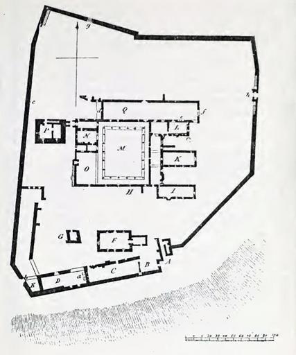 Keywords: Hulne Priory, Alnwick - Ground Plan.jpg en Hulne Priory Alnwick - Ground Plan Key A Entrance Tower Porter's Lodge B Guest Hall C Bakehouse Brewhouse Offices a Bath and Well D Farmery E Maltkiln b Modern Entrance F Strangers Chapel as it was in 1760 G Mill House H Site of Refectory I Kitchen K Chapter House L Sacristy M Cloisters N Modern Tower on site of Priers Tower O Church Probably P Embattled Tower c Inscription on Wall d Trophy on Wall Q Principal Church e Sedilia f Great East Window g North Entrance now closed h East gateway with stairs to the Battlements 1869 http //www archive org/details/historyofborough02tate The history of the borough castle and barony of Alnwick 1869 George Tate PD-old-100 Check categories 2011 September 1 en wikipedia Hulne_Priory 2 Uploaded with UploadWizard Hulne Priory Retouched images by User 1Veertje