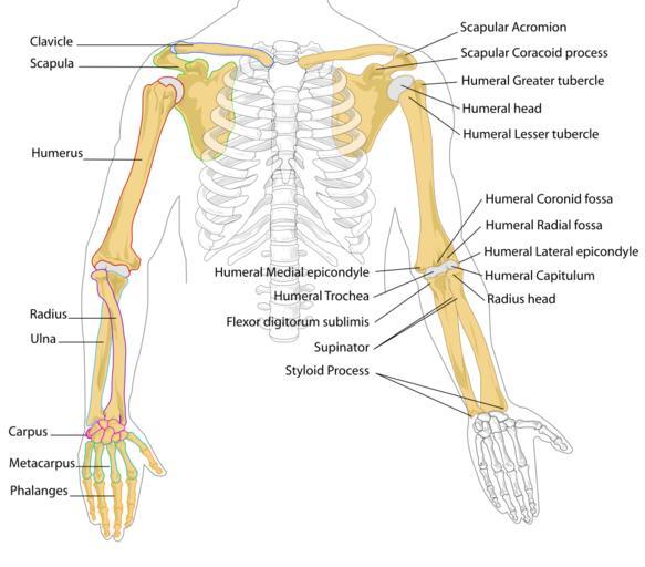 | Keywords: Human arm bones diagram.svg The humerus is the upper arm bone It joins with the scapula above at the shoulder joint or glenohumeral joint and with the ulna and radius below at the elbow joint Notice When the arm is spun so that the thumb point to the outside of the body meaning the palm of the hand looks forward then it is said the hand is supinated But when the thumb remains in the inside and the palm looks backwards then it is said that the hand is pronated In this diagram one hands is pronated and the other supinated in order to show how the ulna and the radius cross while doing this movement Some of my sources http //img80 imageshack us/img80/9274/primal17vo1 jpg Gray's Anatomy Williams Warwick Atlas der anatomie des menschen Sobotta Anatomia del cuerpo humano Yokochi Rhoen weinreb and a lamina printed by rĂ¼diger-anatomie GmbH - LadyofHats 2007-01-03 LadyofHats Mariana Ruiz Villarreal LadyofHats Other versions/Human arm bones diagram Assessments 1 Image Human arm bones diagram svg The bone structure of the human w arm 14 55 10 June 2008 UTC ValidSVG ImageNote 1 441 219 10 10 857 751 2 ribs ImageNoteEnd 1 Bones of the human arm Clavicula Humerus Radius bone Scapula Coracoid process |