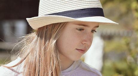 Keywords: human child girl blond face view hat out close