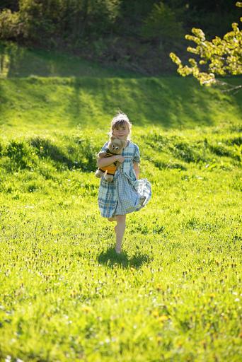 Keywords: human child girl blond teddy bear run meadow grass nature out
