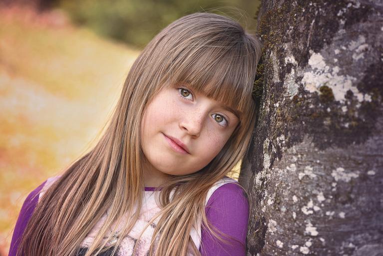 Keywords: human child girl face blond long hair dreamy relaxed tree out nature portrait