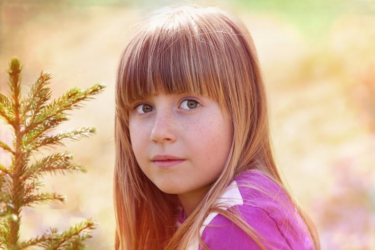 Keywords: human child girl face blond long hair view out nature