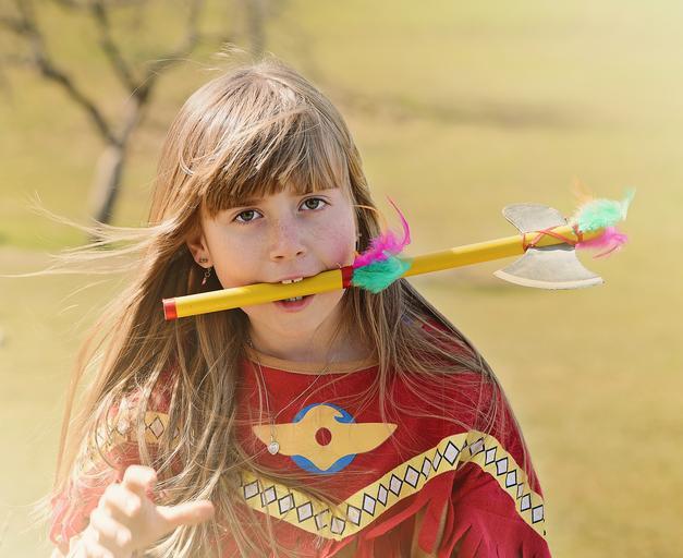 Keywords: human child girl face blond long hair view play indians indian out nature portrait