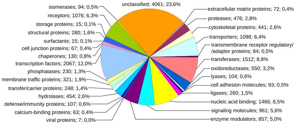 Keywords: Human genome by functions.svg human genome categorized by function of each gene product given both as number of genes and as percentage of all genes http //www pantherdb org/chart/summary/pantherChart jsp filterLevel 1 chartType 1 listType 1 type 5 species Homo 20sapiens PANTHER Pie Chart at the PANTHER Classification System homepage Retrieved May 25 2011 https //docs google com/open id 0B8IdyPbSsy9rb0U2VFFjMm5Cd2M Diagram as an Excel file Mikael Häggström gallery of 2014 2011-05-25 thumb left Older version in png format Data at creation date 1 - Function Number of genes Percent of genome - extracellular matrix protein 72 0 40 - protease 476 2 80 - cytoskeletal protein 441 2 60 - transporter 1098 6 40 - transmembrane receptor regulatory/adaptor protein 84 0 50 - transferase 1512 8 80 - oxidoreductase 550 3 20 - lyase 104 0 60 - cell adhesion molecule 93 0 50 - ligase 260 1 50 - nucleic acid binding 1466 8 50 - signaling molecule 961 5 60 - enzyme modulator 857 5 00 - viral protein 7 0 00 - calcium-binding protein 63 0 40 - defense/immunity protein 107 0 60 - hydrolase 454 2 60 - transfer/carrier protein 248 1 40 - membrane traffic protein 321 1 90 - phosphatase 230 1 30 - transcription factor 2067 12 00 - chaperone 130 0 80 - cell junction protein 67 0 40 - surfactant 15 0 10 - structural protein 280 1 60 - storage protein 15 0 10 - receptor 1076 6 30 - isomerase 94 0 50 - unclassified 4061 23 60 - Total 17209 100 00 Cc-zero Genomics DNA sequencing Human evolution