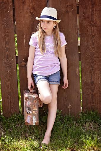 Keywords: human person child girl blond long hair barefoot hat luggage fence wood wait portrait