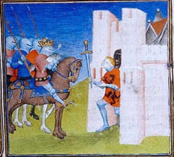 Keywords: Hunald.jpg en Grandes chroniques de France Book V Chapter 28 Hunald of Aquitaine Scene Surrender of Loches -- King possibly Pepin the Short wearing armor and holding shield rides bridled horse with group of soldiers with lances toward castle of Loches from which walks Hunald of Aquitaine wearing heraldic garment with lion rampant and holding blade of sword in right hand fr Grandes chroniques de France Livre V Chapitre 28 Hunald d'Aquitaine Scène de la reddition de Loches -- Le roi probablement Pépin le Bref revêtu d'une armure et portant un bouclier chevauche un cheval harnaché avec un groupe de soldats portant des lances autour du château de Loches duquel sort Hunald d'Aquitaine tenant la lame d'une épée dans sa main droite et habillé d'une tenue sur laquelle est dessinée un lion rampant http //corsair morganlibrary org/icaimages/5/m536 071ra jpg en Master of the Cité des Dames fr Maître de la Cité des Dames circa 1410 1412 PD-old circa 1400 1415 Grandes Chroniques de France - Morgan Library M536 |