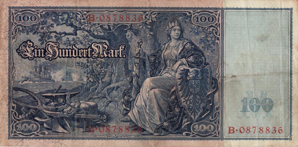 Keywords: Hundert Mark a.jpg en German Goldmark Banknote de Reichsbanknote 1908 Sammlung und Scan Dr Alexander Mayer Deutsche Reichsbank 1908-02-07 PD-GermanGov-currency note PD-old-100 Mark banknotes of the German Empire 0100 19080206 Banknotes with a face value of 100 |
