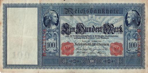 Keywords: Hundert Mark b.jpg en German Goldmark Banknote de Reichsbanknote Sammlung und Scan Dr Alexander Mayer Deutsche Reichsbank 1908-02-07 PD-GermanGov-currency note PD-old-100 Mark banknotes of the German Empire 0100 19080206 Banknotes with a face value of 100 |