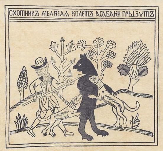 Keywords: HunterLubok.jpg The hunter impales the bear and the dogs bite it Russian lubok Охотник медведя колет а собаки г ызут Лубок http //www zeno org/Kunstwerke/B/Russischer+Holzschneider+um+1800 3A+Der+J C3 A4ger+sticht+den+B C3 A4r hl lubok ca 1800 Anonymous folk artist PD-Art Lubok People with dogs in art People with bears in art Bear hunting in art Images from zeno org |