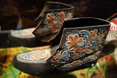 Keywords: Huron (Wyandot) moccasins, 1780-1800, deerskin with moose hair embroidery - Bata Shoe Museum - DSC00674.JPG en Exhibit in the Bata Shoe Museum Toronto Ontario Canada This item is old enough so that its design is in the public domain The museum permitted photography without restriction 2013-07-04 11 38 20 own Daderot cc-zero Moccasins in the Bata Shoe Museum Uploaded with UploadWizard Huron moccasins Wyandot people |