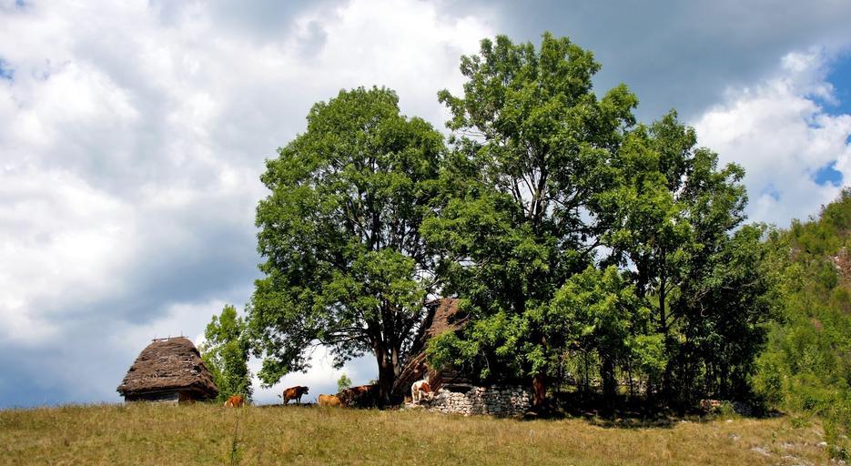 Keywords: hut countryside trees old landscape rural sky cows
