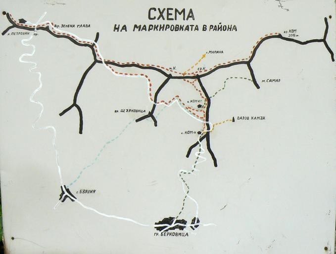 | Keywords: Hut-kom-touristic-map.JPG Схема на ма ш утите в айона на хижа Ком нова Ста а планина Бълга ия Diagram of the touristic routes in the region of hut Kom Balkan Bulgaria Own 2007-08-25 Vassia Atanassova - Spiritia Maps of Stara planina Hiking maps of Bulgaria Photographs of maps |