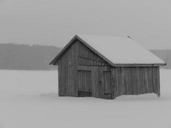 Keywords: hut scale wood log cabin snow winter black white monochrome