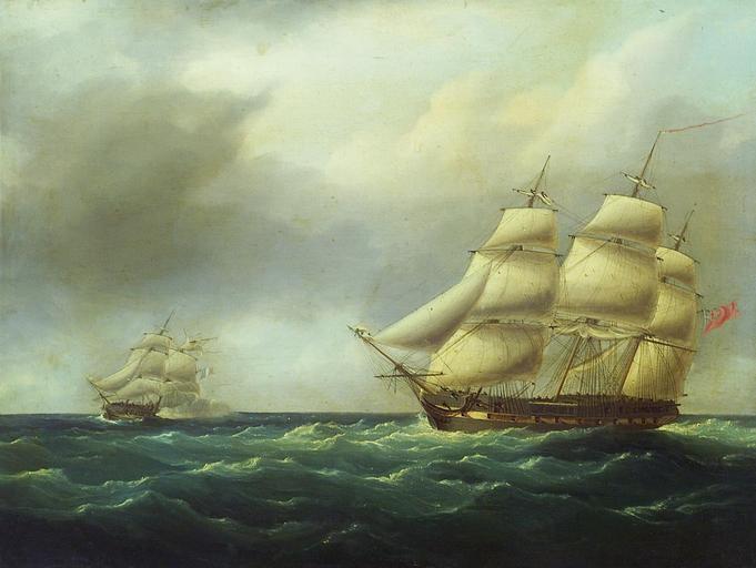 | Keywords: Hydra and Furet.jpg en oil on canvas on board; 460 x 600 mm In the right foreground is the Hydra in port-bow view sailing close-hauled on the starboard tack In the left middle distance is the Furet also port-bow view firing a gun at the Hydra while her main top-gallant mast is falling George Chambers senior 1803-40 painted another version of this action for Mundy in 1832 with a pair to it of Hydra at Cape Bagur in 1807 see also BHC0577 The Chambers pictures were subsequently lithographed by Paul Gauci but that of the Furet action NMM PAG7115 does not relate to this interpretation of it This painting is apparently the pair to BHC0577 being acquired with it for the Museum by Sir James Caird in 1928 as part of the Macpherson Collection 1832 National Maritime Museum Greenwich George Chambers senior 1803-40 PD-Art Uploaded with UploadWizard HMS Hydra 1797 |