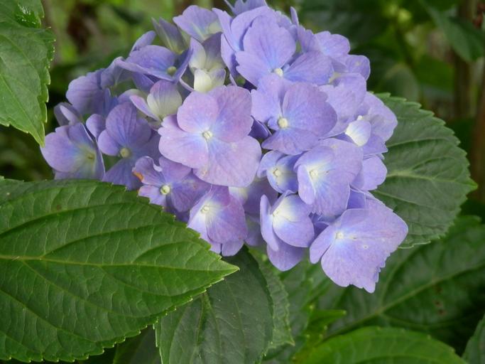 Keywords: hydrangea blue flowrs violet purple blossoms blooms blooming flowering plants green leaves leafy decorative ornamental fleurs colorful petals bunch nature gardens gardening