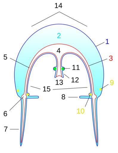 Keywords: Hydromedusa.svg Morphology of an Hydromeduse Morphologie einer Qualle Own 30-III-2007 Xavier Vázquez PD Leyenda Translation table o 100 1 - Ectodermis; 2 - Mesoglea; 3 - Gastrodermis; 4 - Estómago; 5 - Canal radial; 6 - Canal circular; 7 - Tentáculo; 8 - Velo; 9 - Anillo nervioso externo; 10 - Anillo nervioso interno; 11 - Gónada; 12 - Manubrio; 13 - Boca; 14 - Exumbrela; 15 - Subumbrela 1 Ectoderme; 2 Mésoglée; 3 Endoderme; 4 Estomac; 5 Canal radial; 6 Canal circulaire; 7 Tentacule; 8 Voile; 9 Anneau nerveux externe; 10 Anneau nerveux interne; 11 Gonades; 12 Manubrium; 13 Bouche; 14 Partie externe; 15 Partie interne; Anthoathecata Cnidaria anatomy SVG anatomy Diagrams labelled with numbers only |