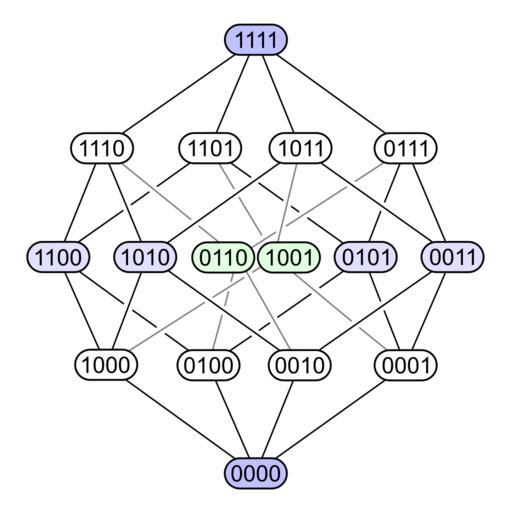 Keywords: Hypercubeorder binary.svg The <nowiki>4D-</nowiki>hypercube layered according to distance from one corner <br />As described in Alice in Wonderland by the Cheshire Cat this vertex-first-shadow of the tesseract forms a rhombic dodecahedron <br /> Note that the two central green vertices should coincide if using an orthogonal projection from 4 to 3 dimensions but were drawn here slightly apart <br /> The eight nibbles with odd binary digit sums form a cube and are marked in white <br /> The two pallindromes 0110 and 1001 compare XOR and XNOR are projected in the center of the rhombic dodecahedron and are marked in green <br /> The other six nibbles with even binary digit sums form an octahedron and are marked in blue <br> 300px Inkscape ValidSVG own 2010 Watchduck public domain 300px Rhombic dodecahedral tesseract shadow; 16 vertices 2-fold rotational symmetry Binary numeral system Tesseract Hasse diagrams Colored nibbles blue green white |