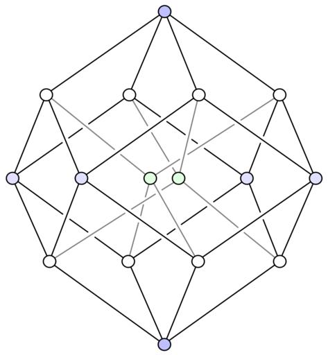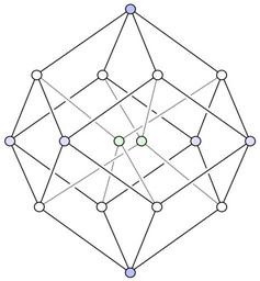 Keywords: Hypercubeorder.svg The 4D-hypercube layered according to distance from one corner <br> As described in Alice in Wonderland by the Cheshire Cat this vertex-first-shadow of the tesseract forms a rhombic dodecahedron <br> The two central vertices would coincide in an orthogonal projection from 4 to 3 dimensions but here they were drawn slightly apart Inkscape own 2007 Mate2code 300px 300px Rhombic dodecahedral tesseract shadow; 16 vertices 2-fold rotational symmetry Colored nibbles blue green white |