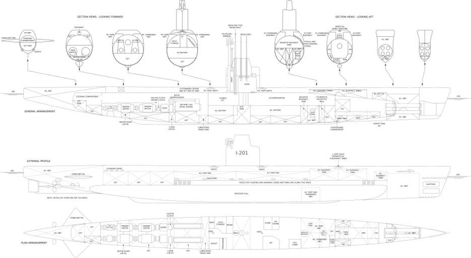 Keywords: I-201 class general arrangement sections.svg en GA profile plan and section views of WW2 era Japanese submarine I201 Part of the I-201 class of high-speed submarines own Lakkasuo 2010-10-12 Vectorised from US Navy sources that are in the public domain I-201 class submarine General arrangements Sectioned drawings |