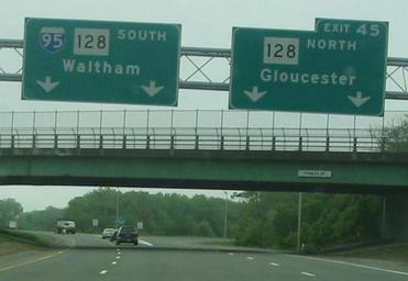 Keywords: I-95 south exit 45.jpg I-95 south at exit 45 in Massachusetts Taken May 26 2004 by SPUI own SPUI spuiphoto Interstate 95 in Massachusetts Massachusetts Route 128 Road sign gantries in Massachusetts