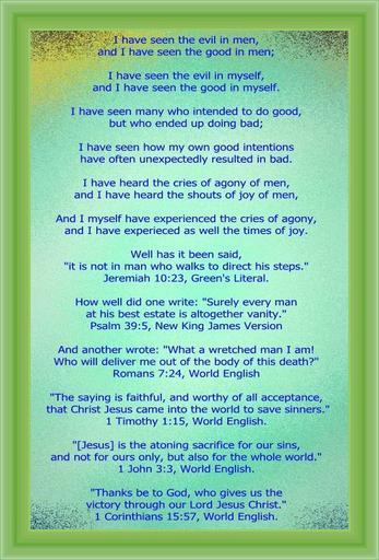 | Keywords: text screenshot I have seen the evil in men, and I have seen the good in men; I have seen the evil in myself, and I have seen the good in myself. I have seen many who intended to do good, but who ended up doing bad; I have seen how my own good intentions have often unexpectedly resulted in bad. I have heard the cries of agony of men, and I have heard the shouts of joy of men, And I myself have experienced the cries of agony, and I have experieced as well the times of joy. Well has it been said, "it is not in man who walks to direct his steps." Jeremiah 10:23, Green's Literal. How well did one write: "Surely every man at his best estate is altogether vanity." Psalm 39:5, New King James Version And another wrote: "What a wretched man I am! Who will deliver me out of the body of this death?" Romans 7:24, World English "The saying is faithful, and worthy of all acceptance, that Christ Jesus came into the world to save sinners." 1 Timothy 1:15, World English. "[Jesus] is the atoning sacrifice for our sins, and not for ours only, but also for the whole world." 1 John 3:3, World English. "Thanks be to God, who gives us the victory through our Lord Jesus Christ." 1 Corinthians 15:57, World English. I have posted a graphic of this at: wisdom.reslight.net/ihaveseen.html I have seen the evil in men, and I have seen the good in men; I have seen the evil in myself, and I have seen the good in myself. I have seen many who intended to do good, but who ended up doing bad; I have seen how my own good intentions have often unexpectedly resulted in bad. I have heard the cries of agony of men, and I have heard the shouts of joy of men, And I myself have experienced the cries of agony, and I have experieced as well the times of joy. Well has it been said, "it is not in man who walks to direct his steps." Jeremiah 10:23, Green's Literal. How well did one write: "Surely every man at his best estate is altogether vanity." Psalm 39:5, New King James Version And another wrote: "What a wretched man I am! Who will deliver me out of the body of this death?" Romans 7:24, World English "The saying is faithful, and worthy of all acceptance, that Christ Jesus came into the world to save sinners." 1 Timothy 1:15, World English. "[Jesus] is the atoning sacrifice for our sins, and not for ours only, but also for the whole world." 1 John 3:3, World English. "Thanks be to God, who gives us the victory through our Lord Jesus Christ." 1 Corinthians 15:57, World English. I have posted a graphic of this at: wisdom.reslight.net/ihaveseen.html |