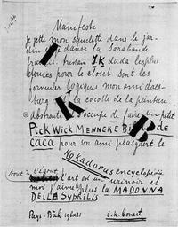 Keywords: I.K. Bonset Manifeste IKB.jpg ink paper cm 27 4 21 3 Bibliothèque littéraire Jacques-Doucet 1921 1 black and white image object history - 1921 1963 Tristan Tzara 1896-1963 Paris ProvenanceEvent 1963 inheritance Christophe Tzara Tristan Tzara Paris ProvenanceEvent 1967 acquisition LangSwitch the la de Bibliothèque littéraire Jacques-Doucet Paris Christophe Tzara exhibition history Van Doesburg and the International Avant-Garde 256 London ˜I K Bonset Theo van Doesburg I K B Manifesto Dadaglobe 1921 Handwritten manuscript ™ credit line accession number BLJD cote TZR 783 43 Marco Entrop 1988 ˜ ˜Je suis contre tout et tous ™ I K Bonset en Tristan Tzara's Dadaglobe ™ Jong Holland Tweemaandelijks tijdschrift voor moderne kunst en vormgeving vol 4 no 4 p 29 PD-old I K Bonset Manuscripts by Theo van Doesburg Bibliothèque littéraire Jacques-Doucet Dadaglobe |