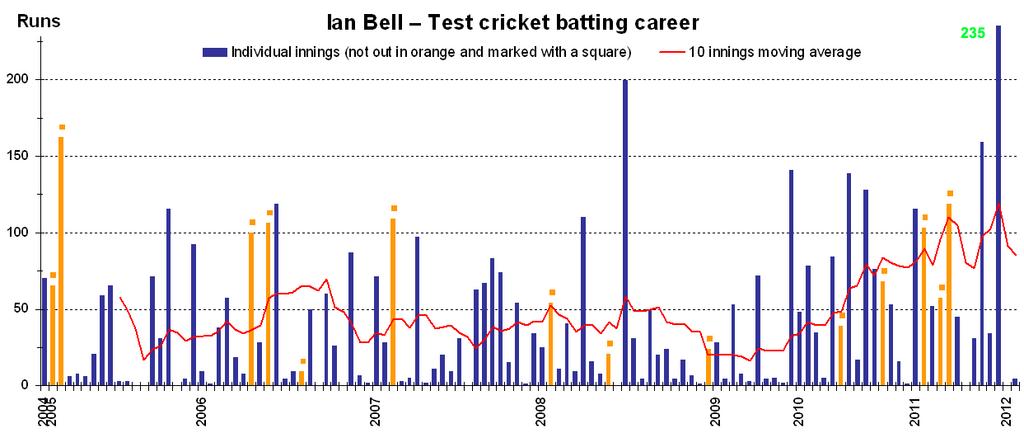 | Keywords: Ian Bell test batting career v2.png This graph details the test match performance of cricketer w Ian Bell and was created by en wiki w user EdChem Each bar indicates a single test match innings blue ones for innings in which he was dismissed orange ones marked with a square for innings in which he batted but was not out The red line shows a 10 innings moving average as at the end of each innings The files w File Ian Bell test batting career v1a png and w File Ian Bell test batting career v1b png shows the same performance data but with a career batting average as at the end of each innings rather than the 10 innings moving average and use different vertical scales <p>The graph was generated with Microsoft Excel 2003 the resulting chart being copied to Adobe Photoshop 9 and saved in png format using data from w Cricinfo http //stats espncricinfo com/ci/engine/player/9062 html class 1;orderby start;template results;type batting;view innings and w Howstat http //www howstat com au/cricket/Statistics/Players/PlayerProgressBat asp PlayerID 3207 This version is current as at 22 January 2012 which is also the date it was prepared en wikipedia FastilyClone MTC EdChem w other versions EdChem wikipedia en Cc-zero Original upload log page en wikipedia Ian+Bell+test+batting+career+v2 png wikitable - 2012-01-22 12 02 32 1243× 525× EdChem This graph details the test match performance of cricketer Ian Bell and was created by en wiki user EdChem Each bar indicates a single test match innings blue ones for innings in which he was dismissed orange ones marked with - Uncategorized 2016 July 24 |