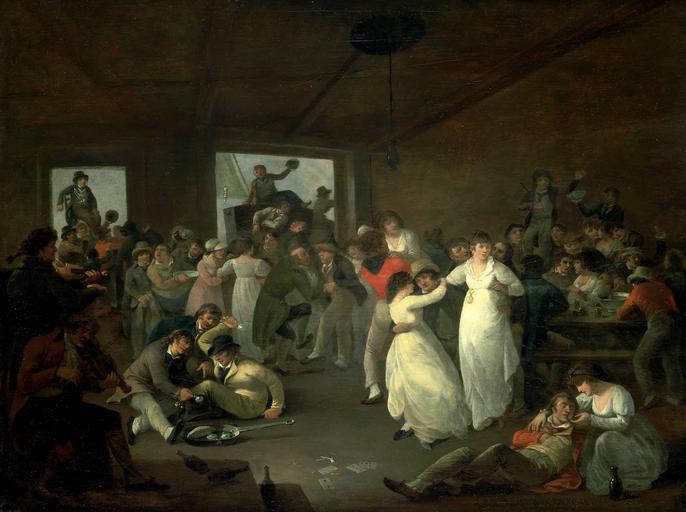 Keywords: Ibbetson-SailorsCarousing.jpg Artwork Creator Julius Caesar Ibbetson A scene in an unspecified tavern at Portsmouth after one or more ships have been paid off The painting may be a retrospective celebration of the Battle of the Glorious First of June 1794 since although executed much later and after Ibbetson had moved to the north of England it reuses elements of a watercolour by him showing a similar scene and dated 3 July 1794 The room is crowded with sailors and men and women carousing The ceiling floors and walls enclose the action and a single lamp hangs from the ceiling to the right The outline of a carriage with several revellers alighting or departing frames the door on the right The opening to the left shows a seaman wearing a hat and chain with a boatswain's whistle borne aloft on a chair Two bare-headed women are highlighted in the foreground the one to the right has two men paying attention to her and the woman on the left sits on a sailor's knee Impropriety is implied in their conduct Although sailor's pay was low and often in arrears prize money provided welcome bonuses after victorious actions but it was rarely saved The narrative indicates a group of three seamen in the foreground to the left of centre both pretending to fry their watches or play 'conkers' with them This refers back to a celebrated incident in 1762 when after capturing a Spanish galleon seamen of the 'Active' and 'Favourite' were so loaded with prize money that they were recorded as frying watches as shown One of the women in the foreground wears a watch around her waist 1802 oil panel cm 43 2 58 4 National Maritime Museum object history credit line National Maritime Museum Greenwich London Caird Collection accession number BHC1090 http //www nmm ac uk/collections/nelson/viewObject cfm ID BHC1090 National Maritime Museum PD-old-100 Julius Caesar Ibbetson 1802 paintings Paintings in the National Maritime Museum London |