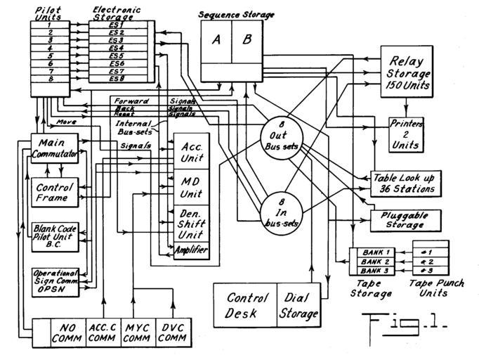 | Keywords: IBM SSEC block diagram.jpg SSEC Designed starting in late 1944 it was demonstrated in January 1948 It was the first computer to be able to treat its own insrtuctions exactly as data However most of its memory was in the form of relays and punched tapes so the capability was not used except rarely It was the last large electro-mechanical calculator built Figure 1 from US Patent 2 636 672 Selective Sequence Electronic Calculator F E Hamilton R R Seeber R A Rowley and E S Hughes January 19 1949 Issued April 28 1953 Joseph Robbins was patent attorney for IBM 1949-01-19 PD-USGov IBM mainframe computers 1948 events Images from US patents |