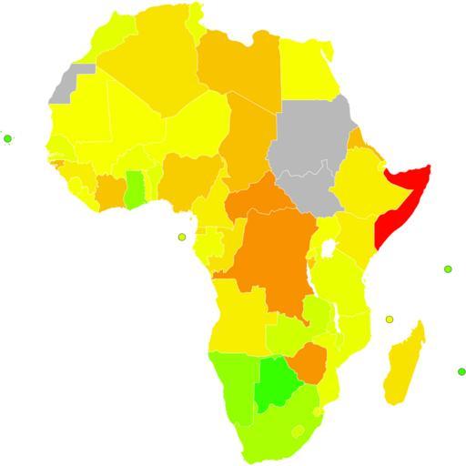 Keywords: Ibrahim-index-of-african-governance-rule-of-law.svg Editor note This map is saved in human-editable plain text format Please do not upload edits saved with Inkscape or similar editors Ibrahim Index of African Governance legend 00ff00 100 80ff00 75 ffff00 50 ff8000 25 ff0000 0 e0e0e0 no data A country with a score X between 0 and 50 is coloured rgb 255 255X/50 0 A country with a score X between 50 and 100 is coloured rgb 255 100-X /50 255 0 This leads to a country with score of 0 being coloured red a country with a score of 50 being coloured yellow and a country with a score of 100 being coloured green The source data from the 2013 report can be found here http //www moibrahimfoundation org/interact/ srl;root Feel free to update this map as new data become available but please retain the current liberal licensing terms Based on File BlankMap-Africa svg Stephen Morley 2010-07-25 <gallery>File Ibrahim-index-of-african-governance svg Overall scores on the Ibrahim Index of African Governance</gallery> cc-zero Demographic maps |