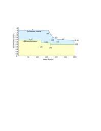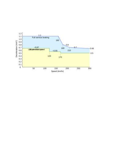 Keywords: ICE3 LZB decel.svg en Deceleration curve of the ICE3 train with full service braking and the deceleration curve required by LZB Based on information from The Linear Eddy-Current Brake of the ICE 3 by Dr -Ing Wolf-Dieter Meler-Credner and Dipl -Ing Johannes Gräber published in Railway Technical Review RTR April 2003 However this format doesn't work Use ICE3 LZB decel png instead own GregGritton 2009-11-27 Eddy current brakes |