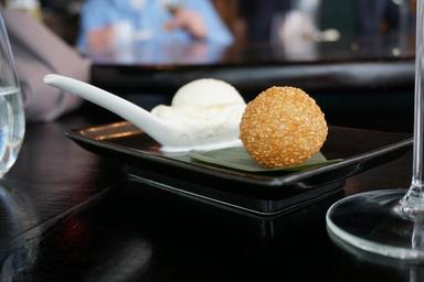Keywords: ice cream dessert sesame seeds dish meal table dinner lunch restaurant food spoon oriental