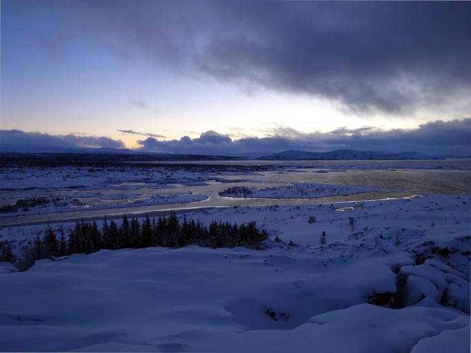 Keywords: iceland thingvellig landscape wide winter snow blue hour clouds sky view lake parliament historically