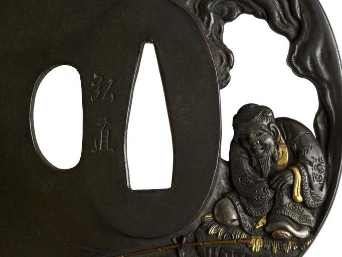 Keywords: Ichiyôsai Hironao - Tsuba with Taikobo (Ch Tai Gongwong) Fishing without Bait - Walters 51191 - Mark.jpg At the right of this tsuba sits the sage Taikôbô Ch Tai Gongwang fishing His tea pot and basket are sitting behind him on the reverse Taikôbô did not use bait because he did not actually want to catch fish He used fishing as an excuse to think about scientific questions He met 12th-century BC emperor Wu Wang when the emperor was hunting and Taikôbô was fishing The emperor was so impressed with Taikôbô that he asked him to serve as a counselor Taikôbô served the emperor for twenty years 1st half Other date century 19 late Edo shibuichi gold cm 6 7 6 2 accession number 51 191 21758 Henry Walters Baltimore date and mode of acquisition unknown Walters Art Museum Henry Walters Acquired by Henry Walters Signature Hironao Déjà Vu Recurrence The Walters Art Museum Baltimore 2007-2008 place of origin Mito Japan Walters Art Museum license Tsuba in the Walters Art Museum Ichiyôsai Hironao Media contributed by the Walters Art Museum needs category review |